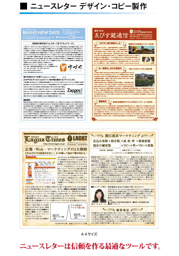 今の時代は、お客様からの信頼がないと商売が成り立ちません。その信頼を勝ちとるために有効的なツールがニュースレターです。月に一度でも、2ヶ月に一度でも、季節ごとにでもかまいません。とにかく、続けることが最も重要です。しかし、普段文章を書く事も、デザインや編集レイアウトなどが慣れていない方達には時間がかかってしょうがないです。ですから定期的に私と1時間程度お話をするだけで、デザイン、コピー編集、写真撮影は全てこちらで作業を致します。