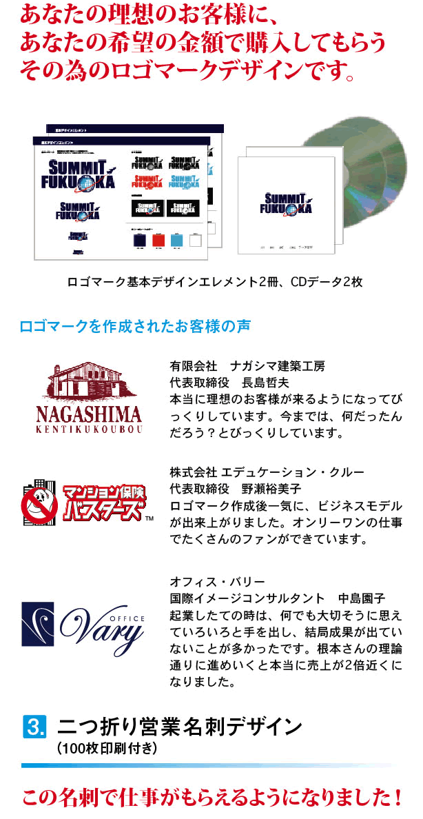 今やネットで検索すれば2〜3万円でロゴマークを作ってくれる会社がゴロゴロとあります。しかしそのほとんどの会社がお客様のコア(本物の理念)を把握できておらず、とりあえずの見た目だけのデザインを作っております。 当社もこれまでに60社以上の小さな会社のロゴマークをデザインしてきてたどり着いた結論がコア(本物の理念)が反映されたロゴマーク=コアマークこ そが小さな会社をわずか半年で売上2倍にもする力を持っていると確信しております。 勝てるポジショニングから強烈な覚悟を表すコンセプト。そしてブランディングを行い、プロモーションの設計からビジネスモデルまでを全てサポートできる福岡では唯一のデザイン会社です。 経営者は様々な物へ投資をしますが、確実なビジネスへの投資が一番のリターンがあると確信しております。