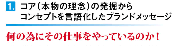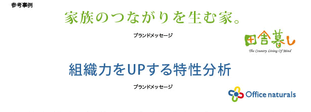 事業を始めて行くにあたって、最初の名刺交換やチラシに封筒に印鑑にホームページにと、ありとあらゆる所でロゴマークは登場してきます。その瞬間瞬間にキチンと記憶に残り、確かな印象を与えるという事は5〜10年というス パンで考えた場合かなりの費用対効果が表れてきます。 最初に発掘したコアをロゴマークにもきちんと反映させ、誰に対して、どんな価値を、どの地域で事業をおこなっていくのか? 実はロゴマークを作る事は、事業の基本戦略を決定することでもあります。そして出来上がったロゴマークとブランドメッセージをいつでも同じ色で同じ書体で刻印し続ける事がブランディングの第一歩です。